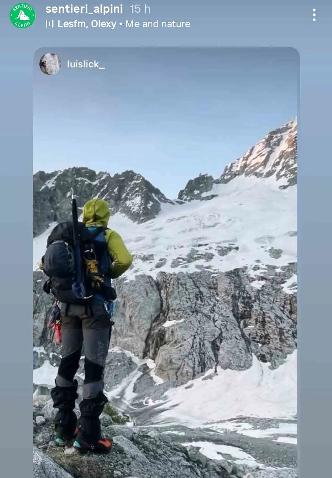 IG: luislick_ Mi piacerebbe condividere questa perenne voglia di avventura in mezzo alla natura selvaggia con coetanei e perché no, magari migliorare ed apprendere da chi ha più esperienza di me 😊 💪 viaggiare con zaino in spalle e fare esperienze alpinistiche magari bivaccando 🗻 ⛺